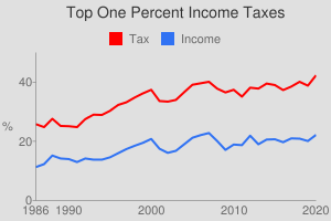 In 2020 the income share of the top one percent was 22.2 percent. Their income tax share was 42.3 percent of total federal income tax collections.